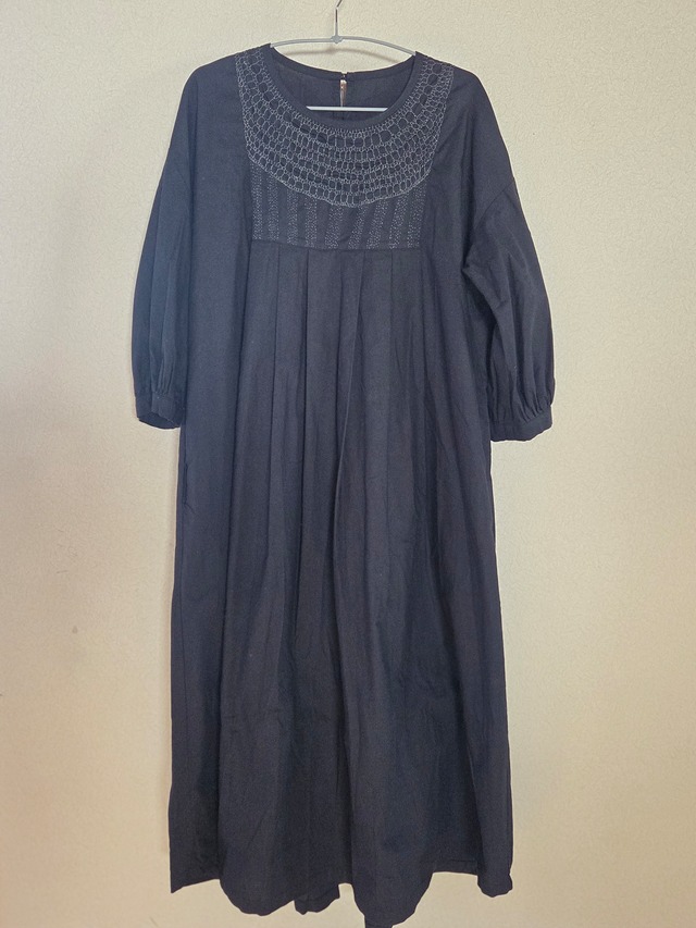 ■煌めく絹糸刺繍のロングワンピースについて 贅沢な絹とラメの撚糸を使用した、手刺繍で描かれた美しいデザインが特徴のロングワンピースです。ブランケットステッチに細やかな工夫が施され、胸元を優雅に飾ります。ゆったりとしたシルエットで、リラックスした着心地を実現しています。 こちらのワンピースは、特別な日のお出かけに華やかさを添える一枚として、また、日常のカジュアルスタイルにもぴったりです。ブラックの落ち着いた色合いは、どんなシーンにも上品さを添えます。 ※上着や小物などの装飾品は付属しません。 ◆素材◆ ・本体:綿混 ・刺繍部分:絹糸、ラメ撚糸 ◆サイズ◆ ・フリーサイズです。 着丈:(約)116cm 肩幅:(約)59cm 胸囲:(約)110cm 袖丈:(約)35cm 裾幅:(約)98cm ※手作業で仕上げているため、サイズに若干の誤差が生じる場合があります。 ◆カラー◆ ブラック ※光の加減により、実際の色合いとは異なる場合がございます。 ◆お取り扱いについて◆ 刺繍部分はデリケートですので、手洗いをお勧めします。洗濯機を使用する際は洗濯ネット等のご利用をお願いいたします。