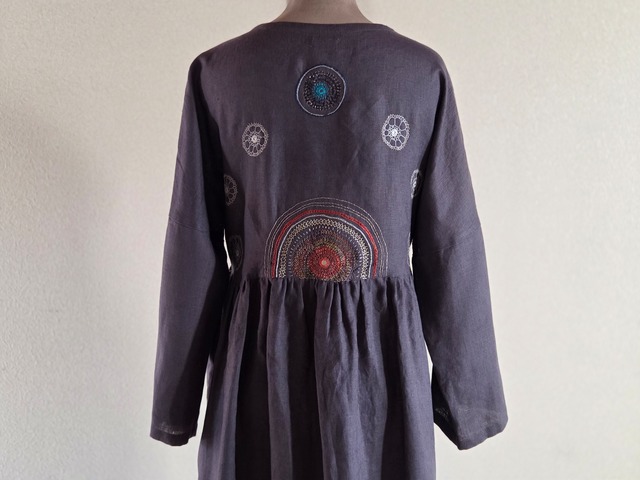 ■インド刺繍のカシュクールワンピースについて 軽やかなリネン生地を使用したライトグレーのカシュクールワンピースは、インド刺繍によって繊細かつ美しいデザインが施されています。 背中のポイントや袖口に施されたミラーワーク刺繍が、特別な魅力を引き立てます。 羽織としてもご利用いただけるため、リラックスした着心地を提供しながら普段使いから特別な日の装いまで幅広く活用できます。 このワンピースをあなたのワードローブに加えて、日常のコーディネートを華やかに演出してみてはいかがでしょうか。 ※インナーワンピースは付属しません。 ◆素材◆ ・本体:リネン100% ・刺繍部分:絹糸、ミラー(ガラス片) ◆サイズ◆ ・ワンサイズです。 総丈:(約)115cm 桁丈:(約)79cm ※素材の特性により、多少の誤差が生じる場合がありますのでご了承ください。 ◆カラー◆ ライトグレー ※光の加減などにより、実際の色合いとは異なる場合がございます。 ◆お取り扱いについて◆ ネットに入れてのお洗濯は可能ですが、頻繁に洗濯機で洗濯すると、まれにミラーが外れることがあります。手洗いをおすすめしますので、丁寧なお手入れをお願いいたします。
