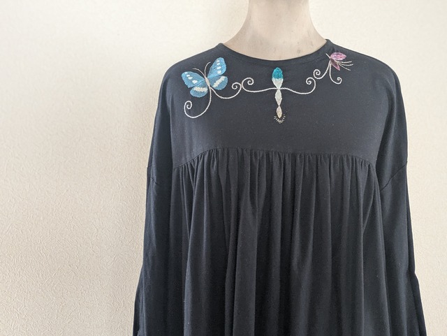 ■蝶々の刺繍のロングワンピースについて 綿混の生地に絹糸を使用し、手刺繍で描かれた美しい蝶々や花々が特徴のロングワンピースです。ゆったりとしたシルエットで、リラックスした着心地を実現しています。 こちらのワンピースは、特別な日にぴったりな華やかさを持ちながらも、日常使いにも最適です。ブラックの色合いが上品で、シックな印象を与えます。 ◆素材◆ ・本体:綿混 ・刺繍部分:絹糸 ◆サイズ◆ ・フリーサイズです。 着丈:(約)116cm 肩幅:(約)63cm 胸囲:(約)110cm 袖丈:(約)35cm 裾幅:(約)101cm ※手作業での仕上げですので、若干の誤差が生じる場合があります。 ◆カラー◆ ブラック ※光の加減により、実際の色合いと異なる場合がございます。 ◆お取り扱いについて◆ 刺繍部分はデリケートなため、手洗いをお勧めします。洗濯機を使用する場合は洗濯ネット等をご利用ください。