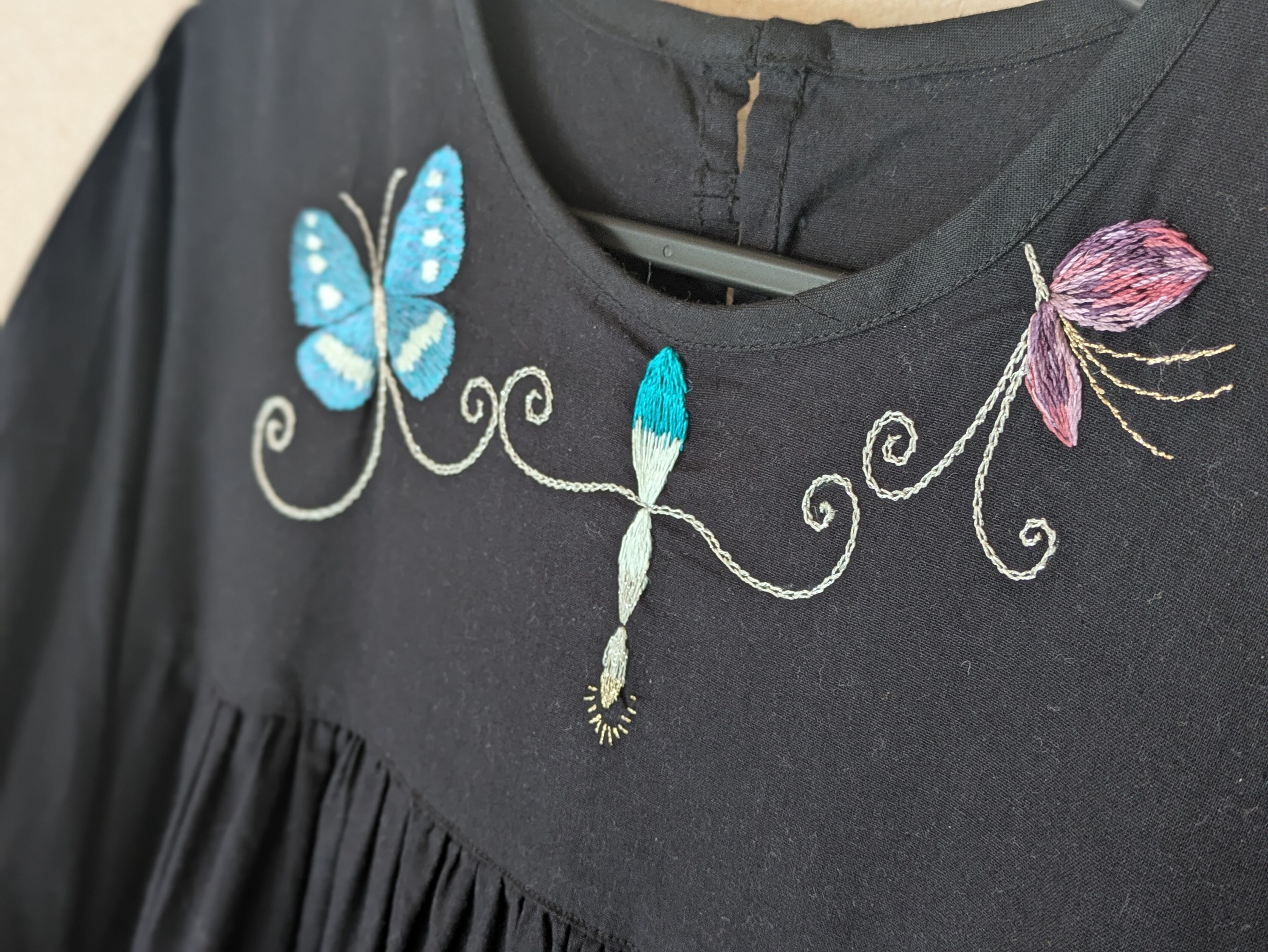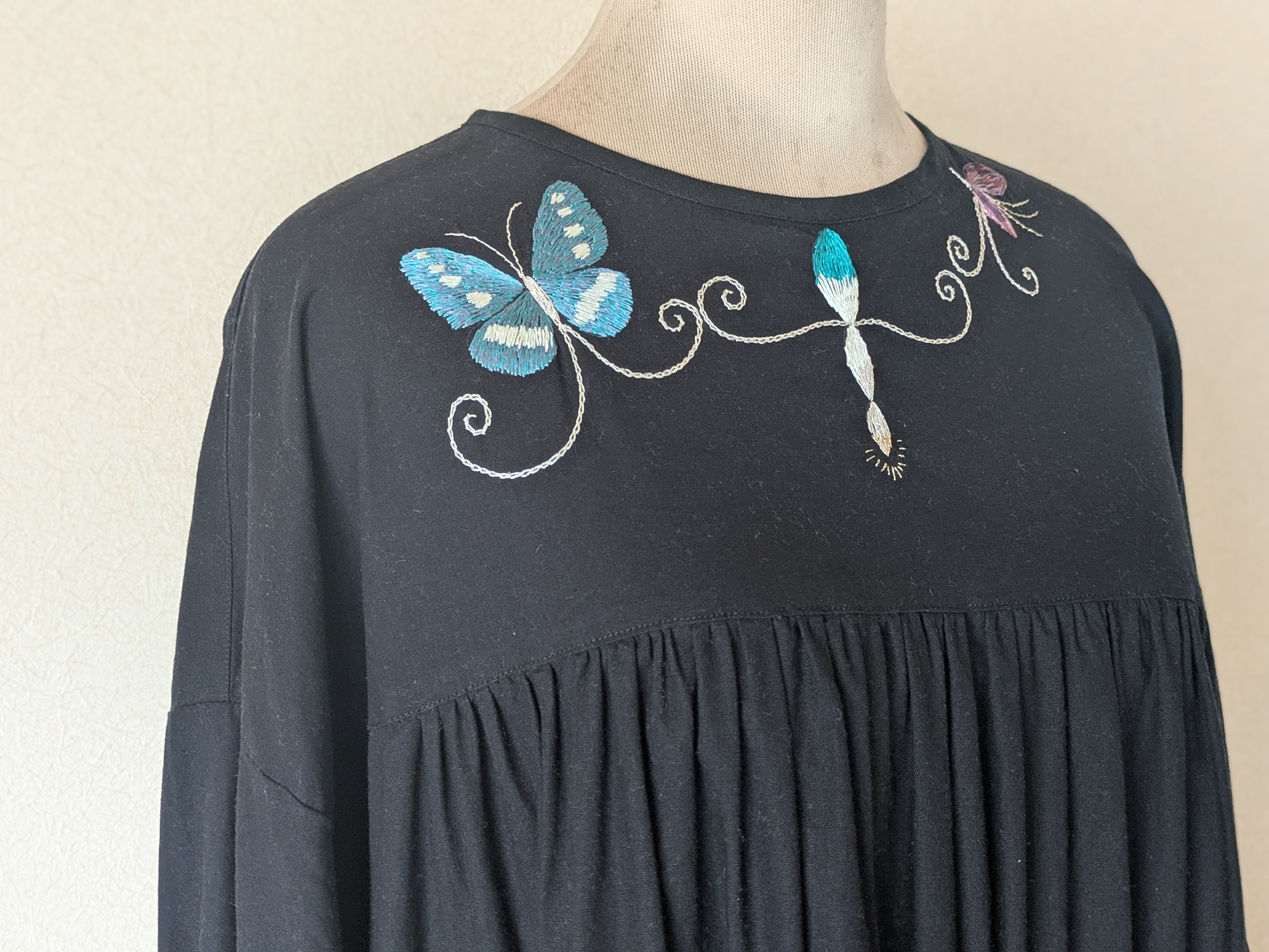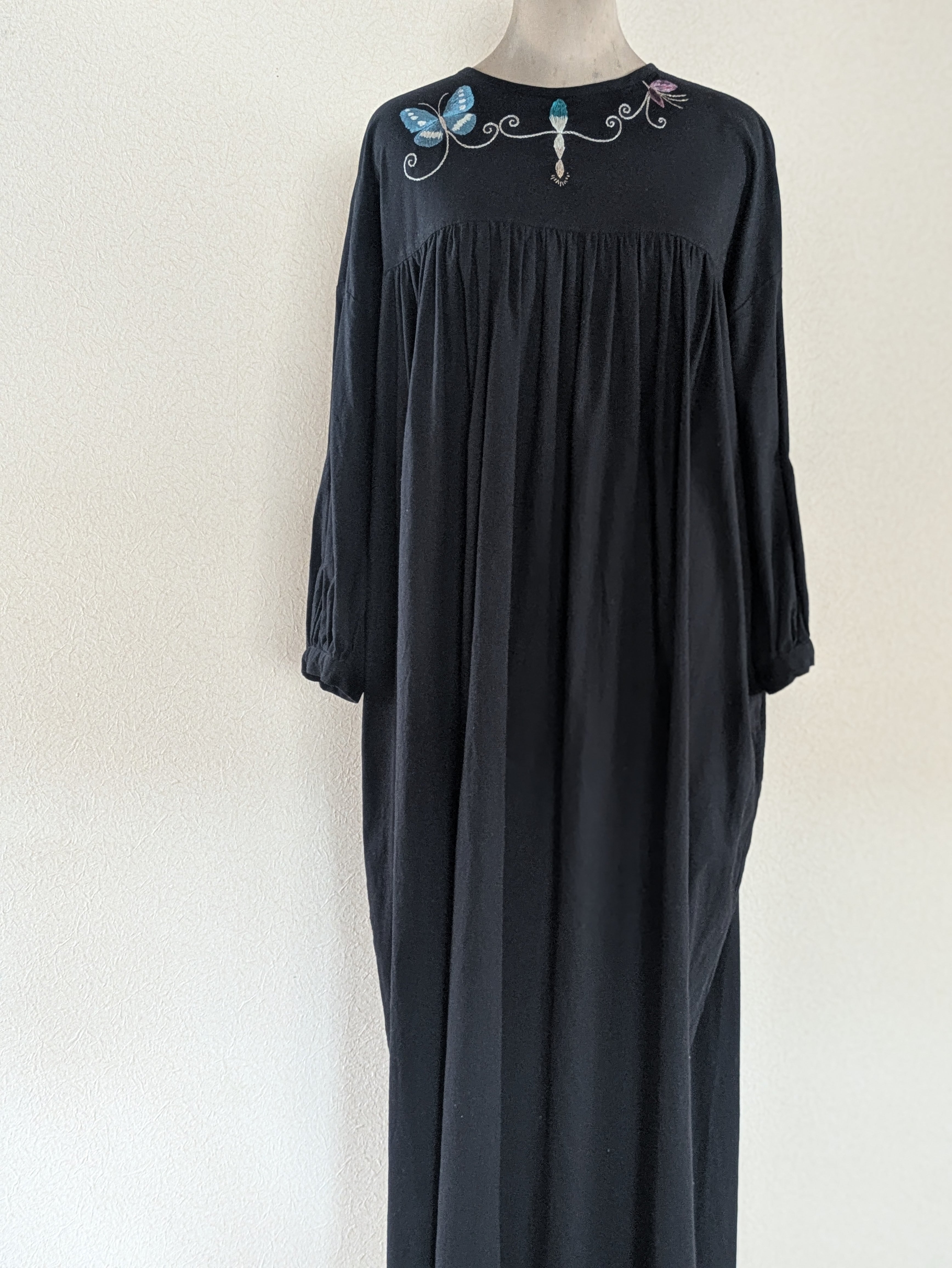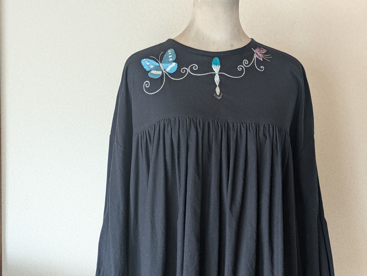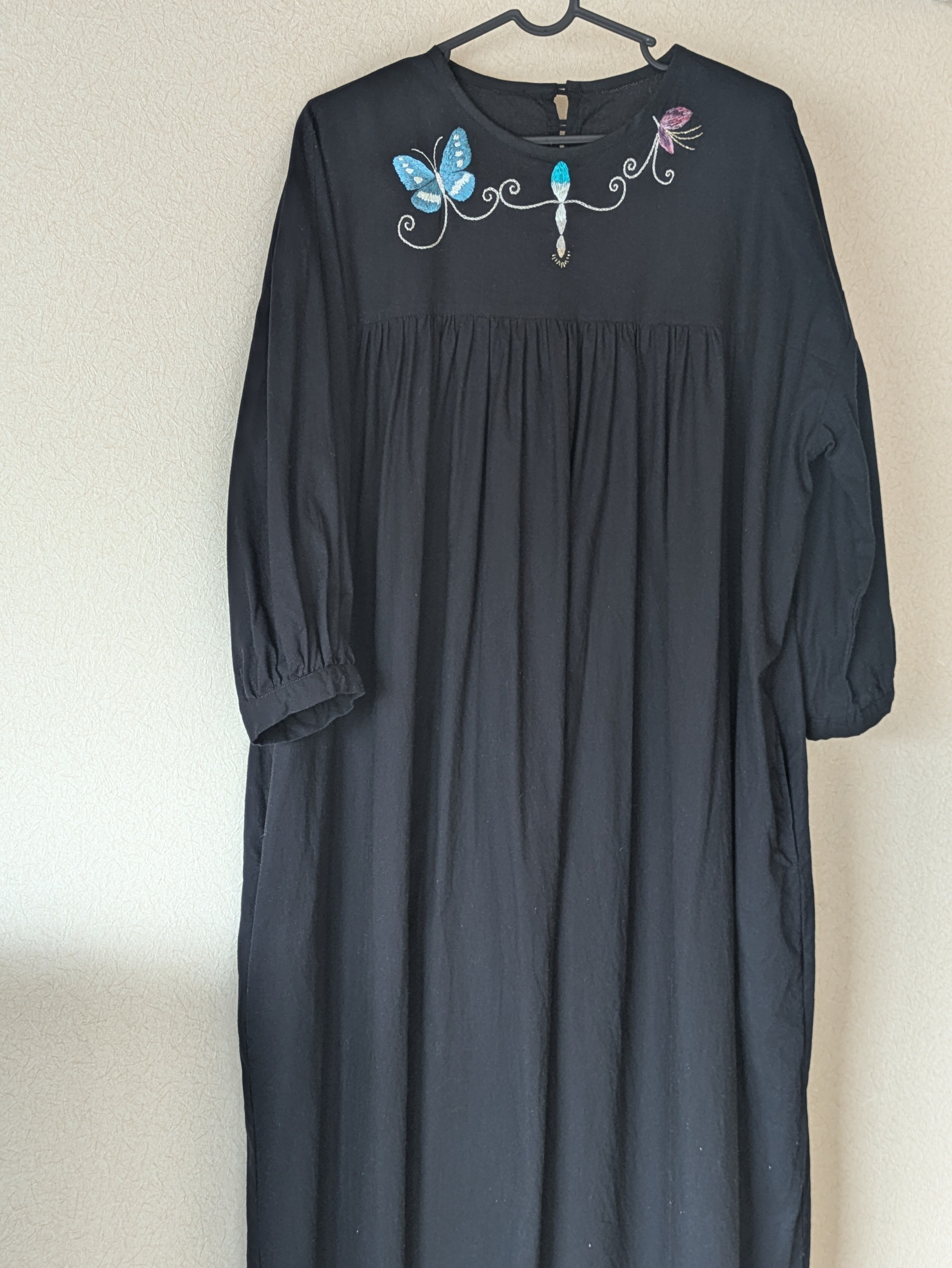 綿混の生地に絹糸を使用し、手刺繍で描かれた美しい蝶々や花々が特徴のロングワンピースです。ゆったりとしたシルエットで、リラックスした着心地を実現しています。