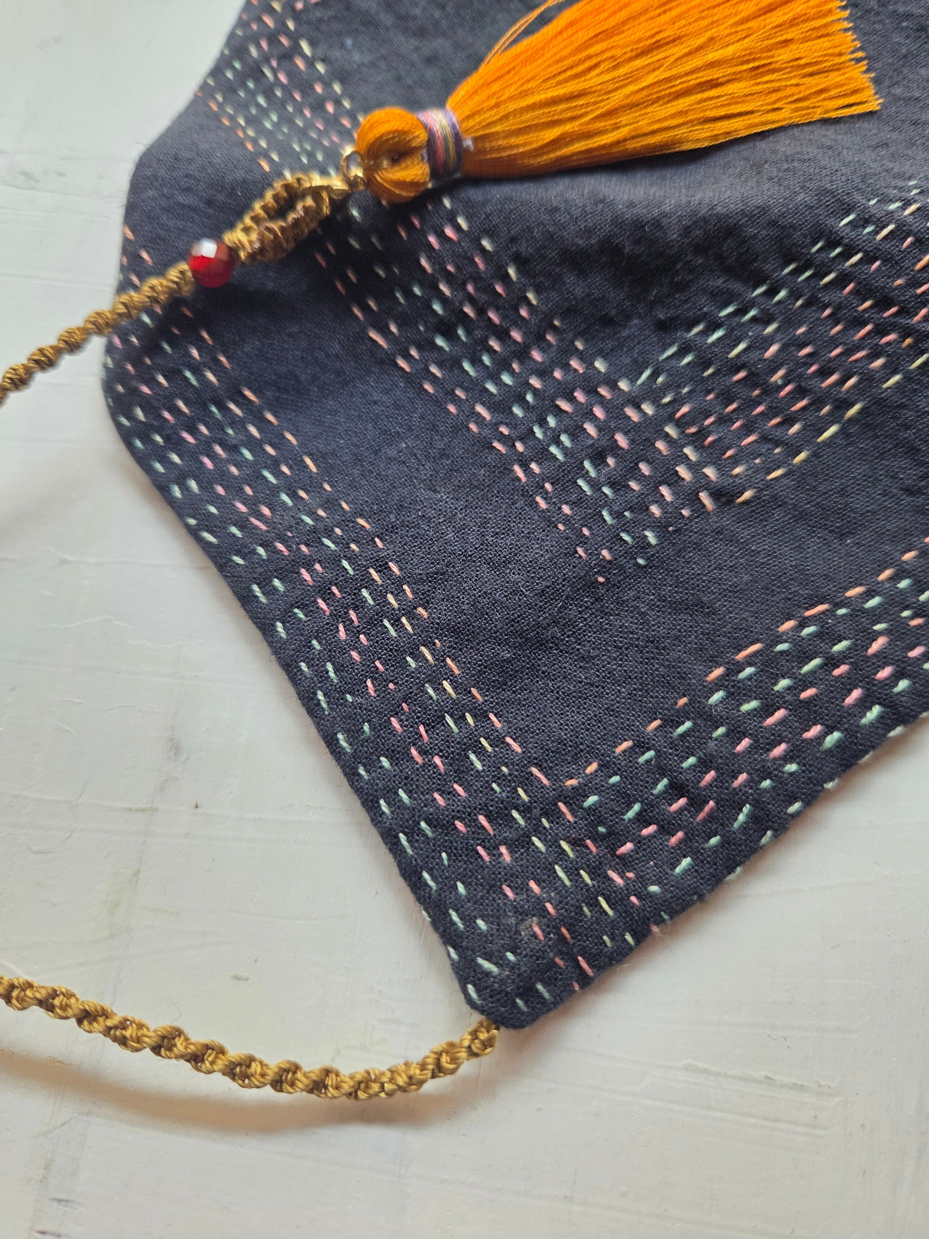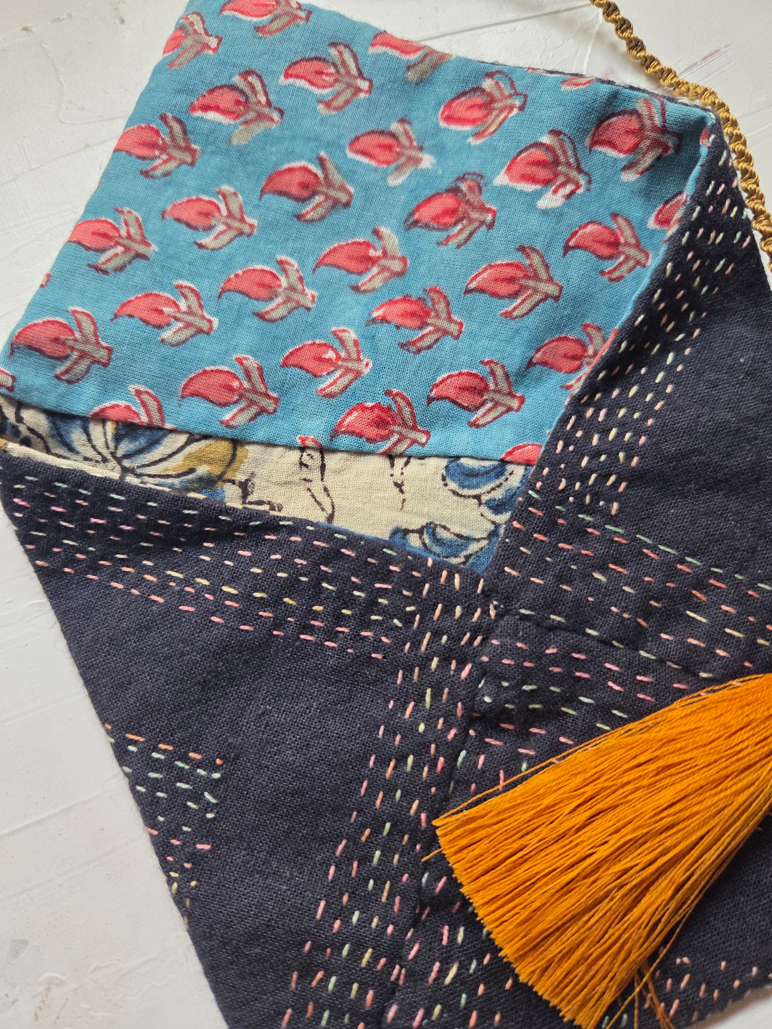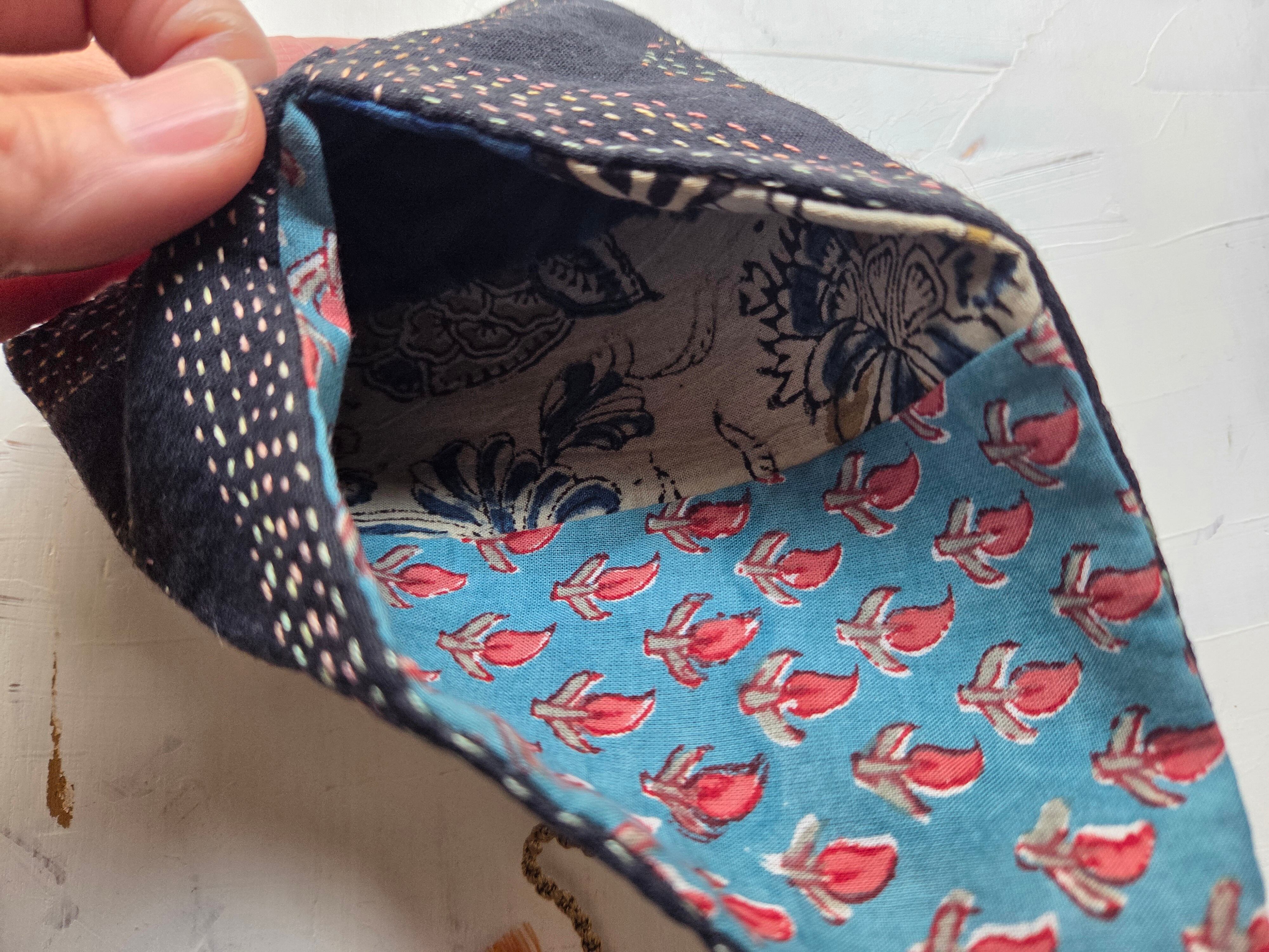 内布にはブロックプリントの生地を使用しており、華やかな印象を与えるデザインが魅力的です。ハギレを活用したこのポーチは、個性的な一品としてお使いいただけます。