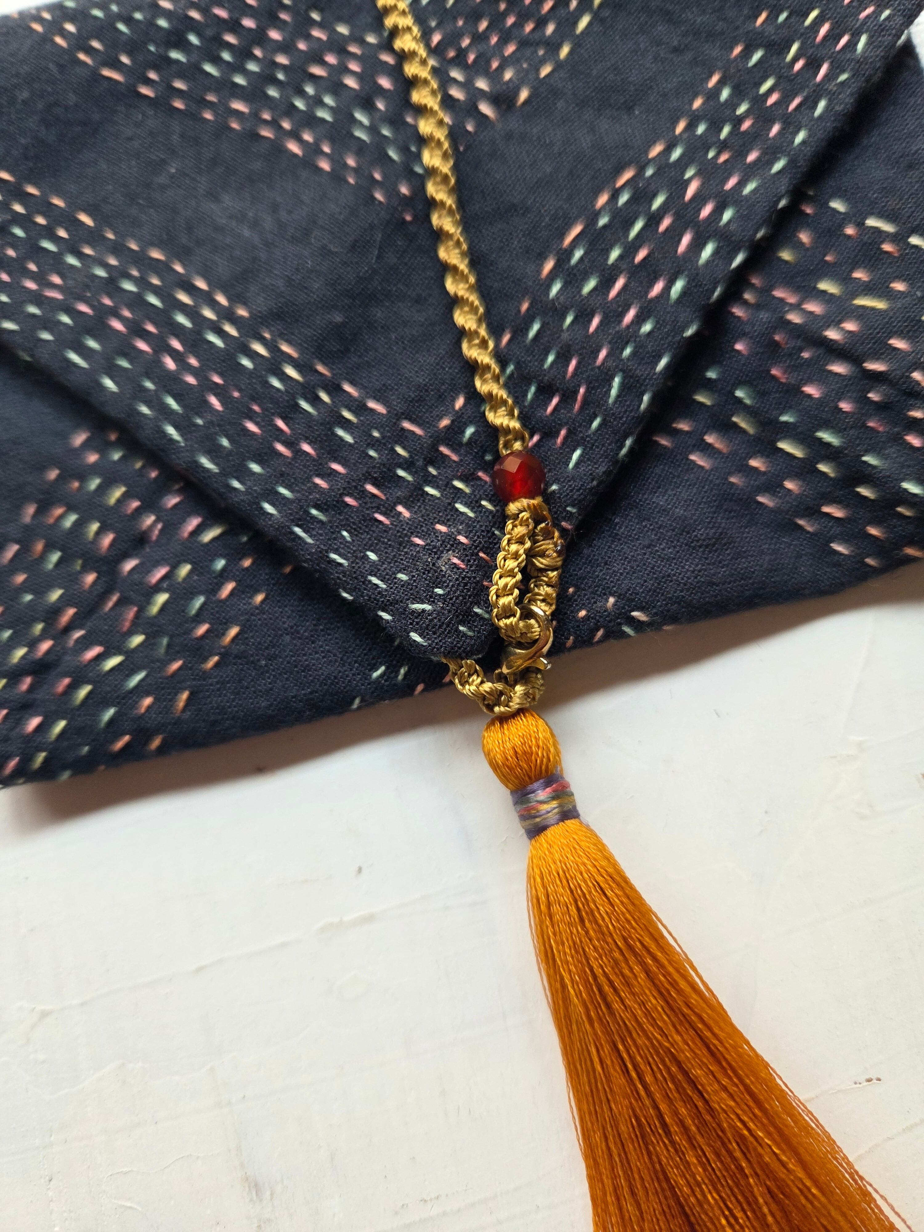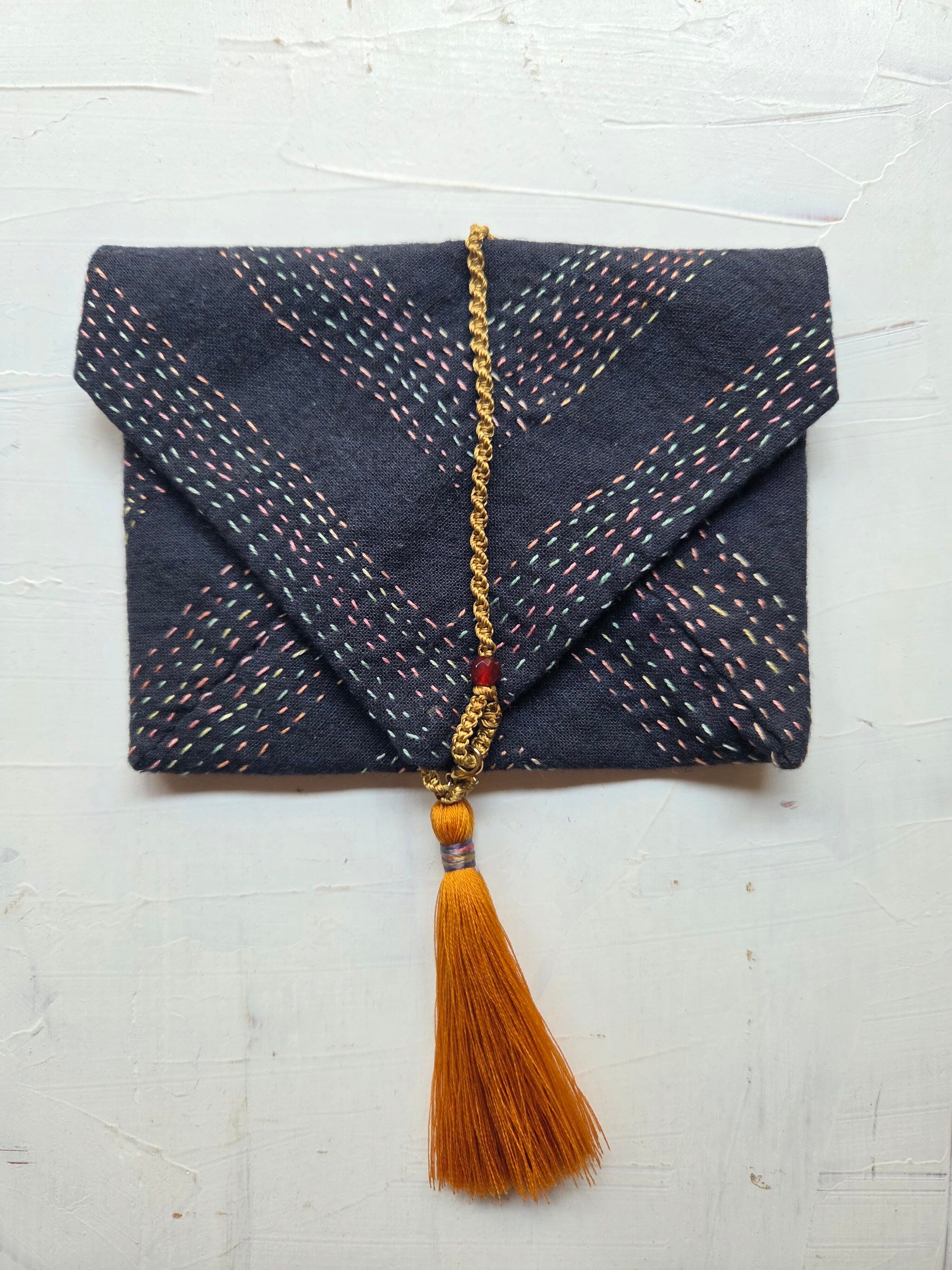 手刺繍による繊細なランニングステッチが施された巻きポーチです。