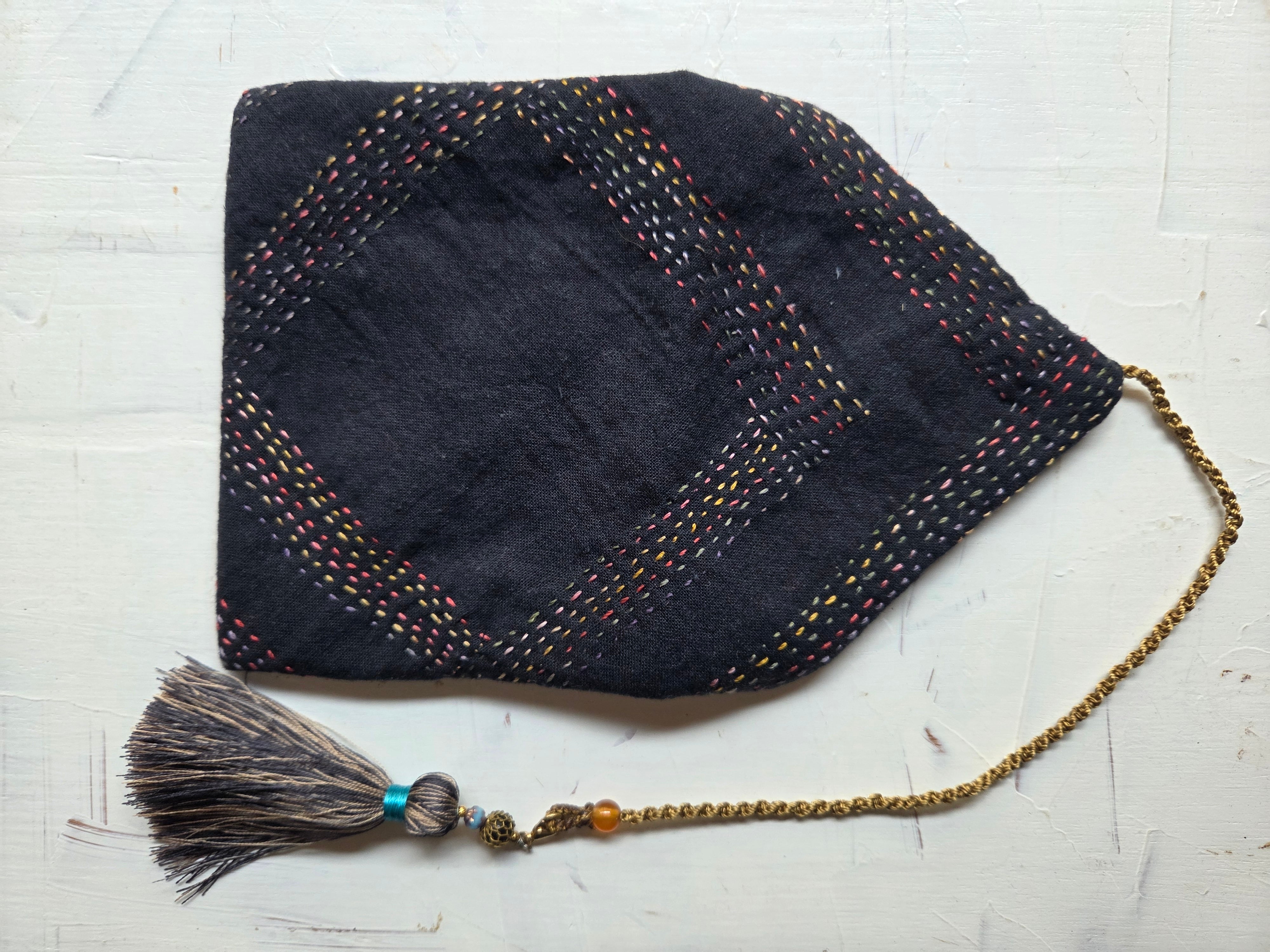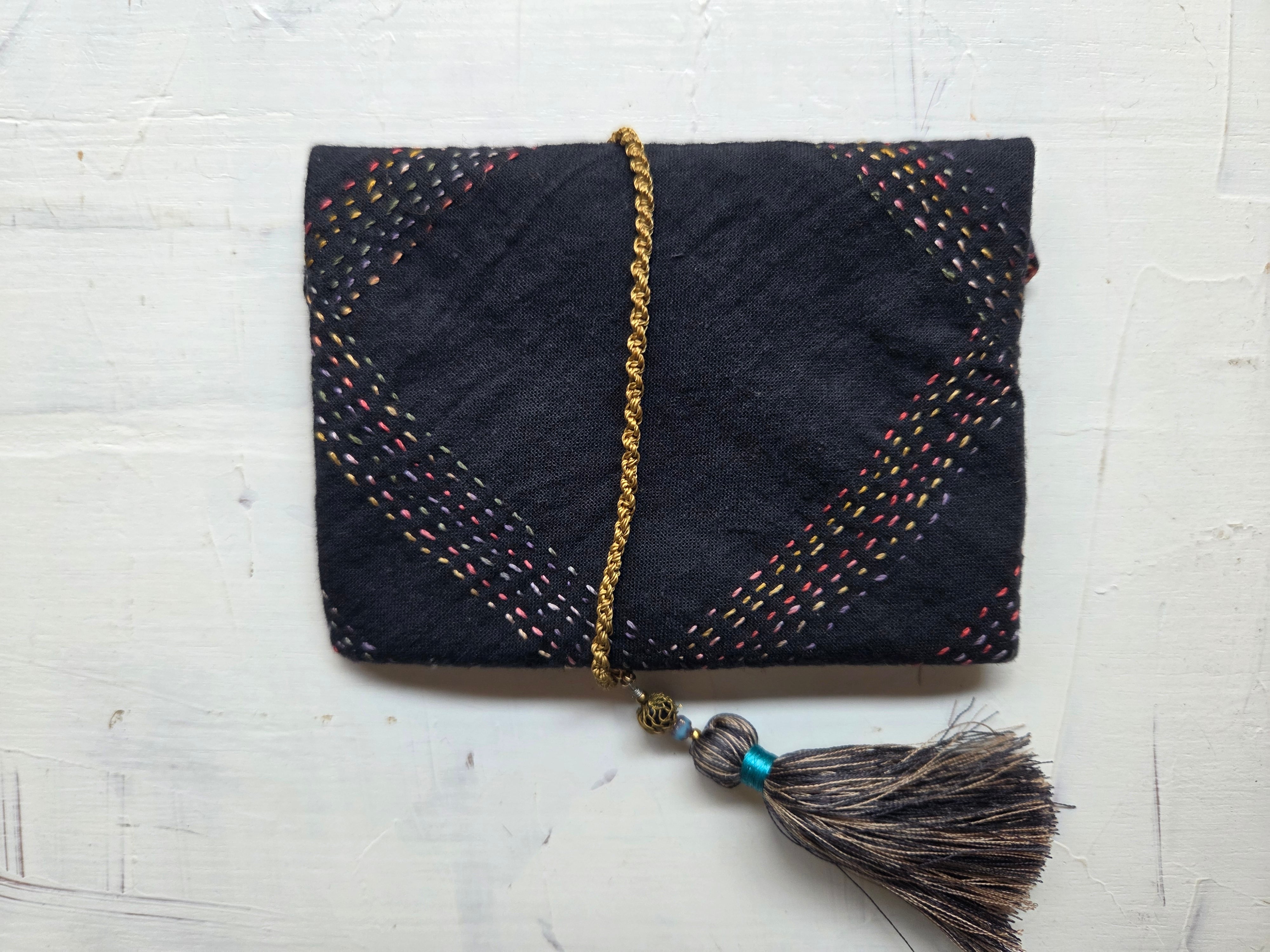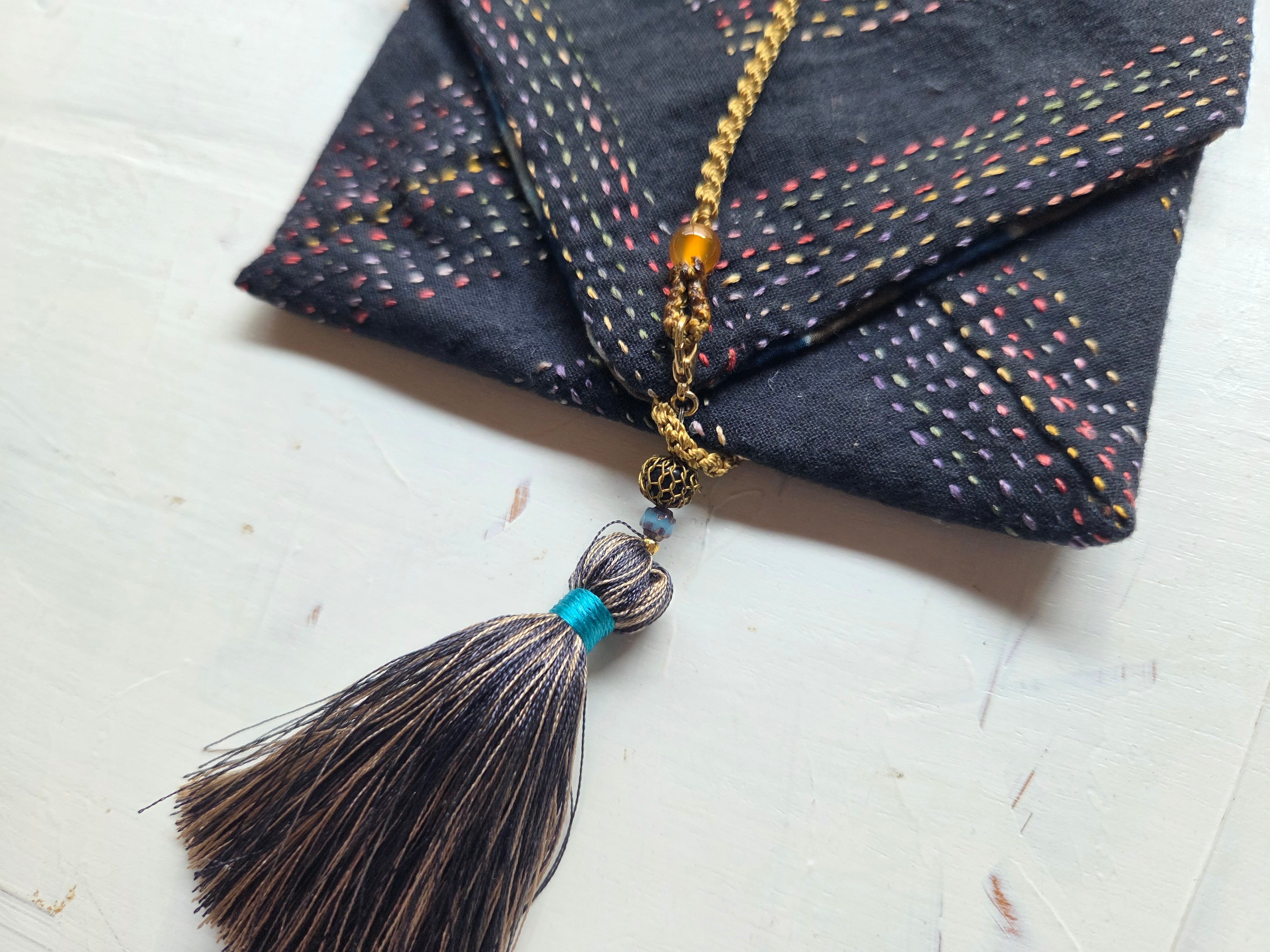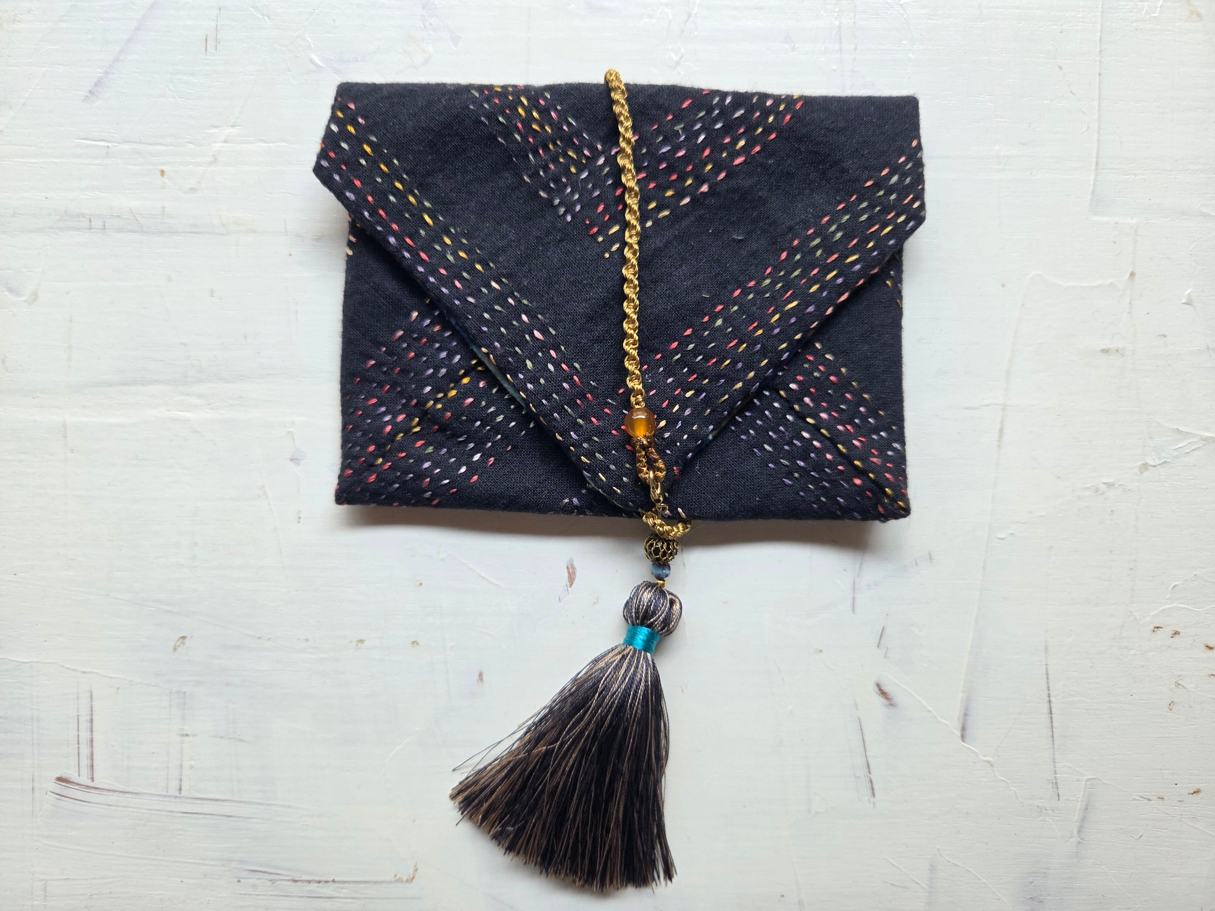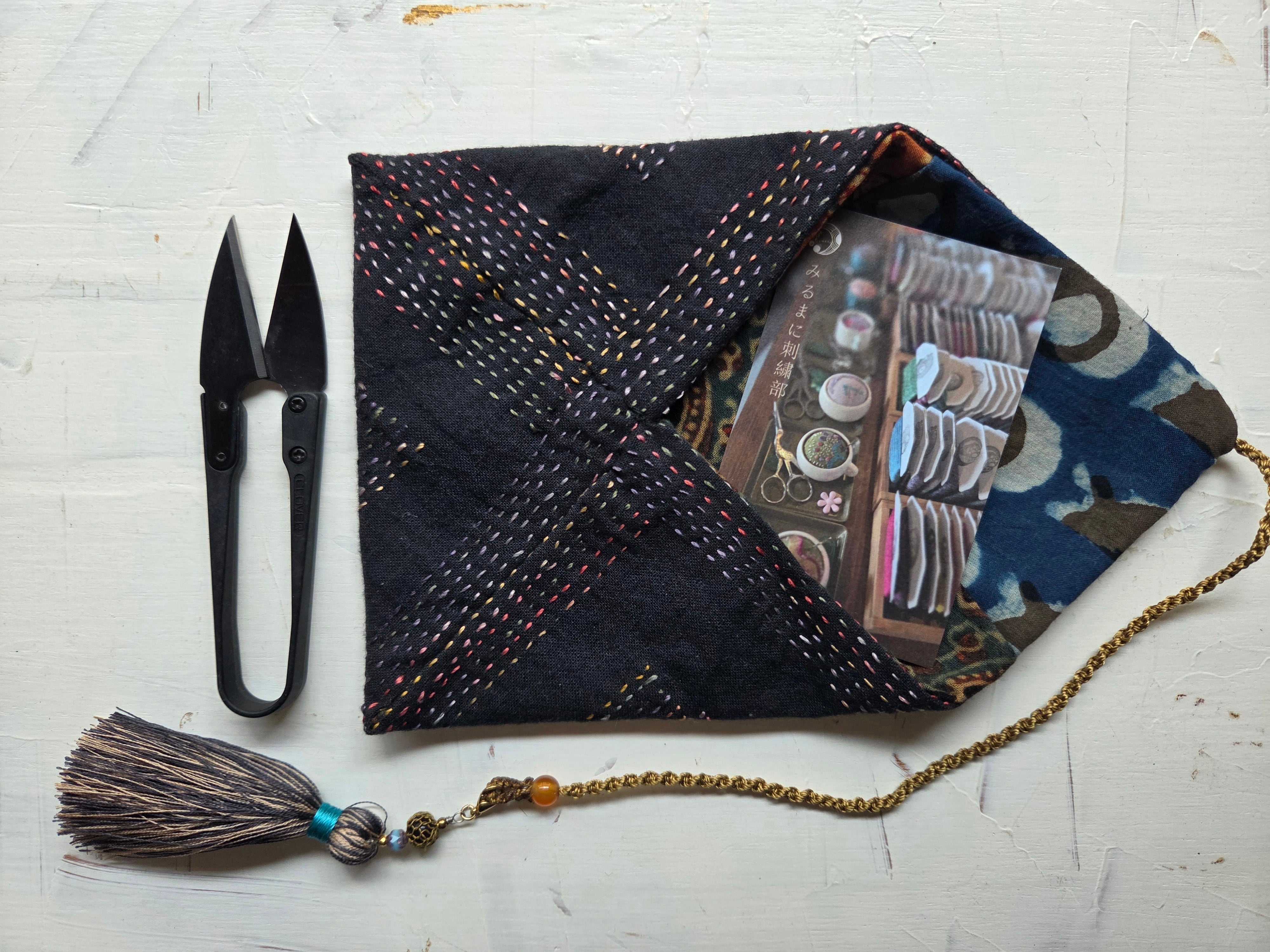 手刺繍による繊細なランニングステッチが施された巻きポーチです。