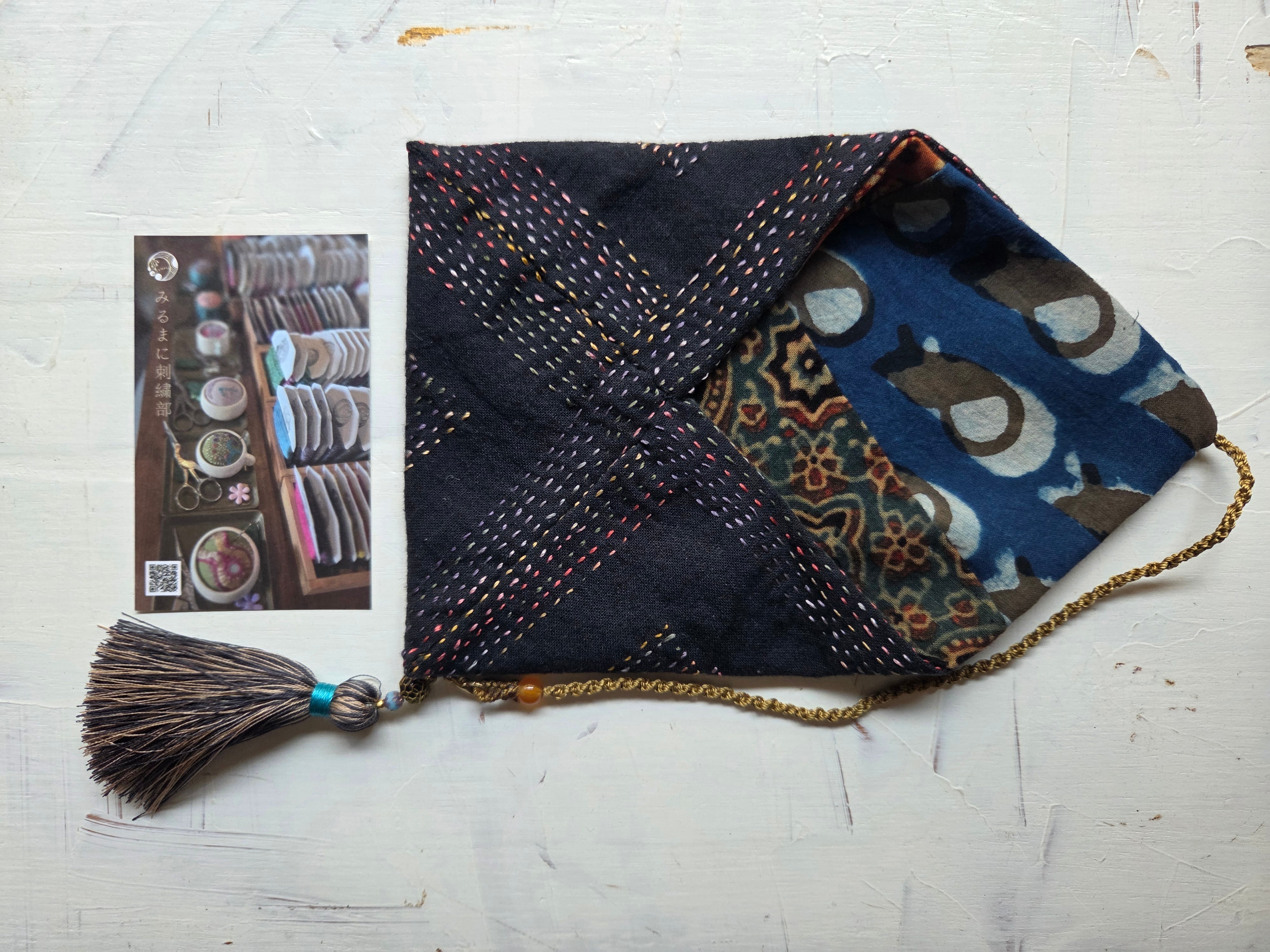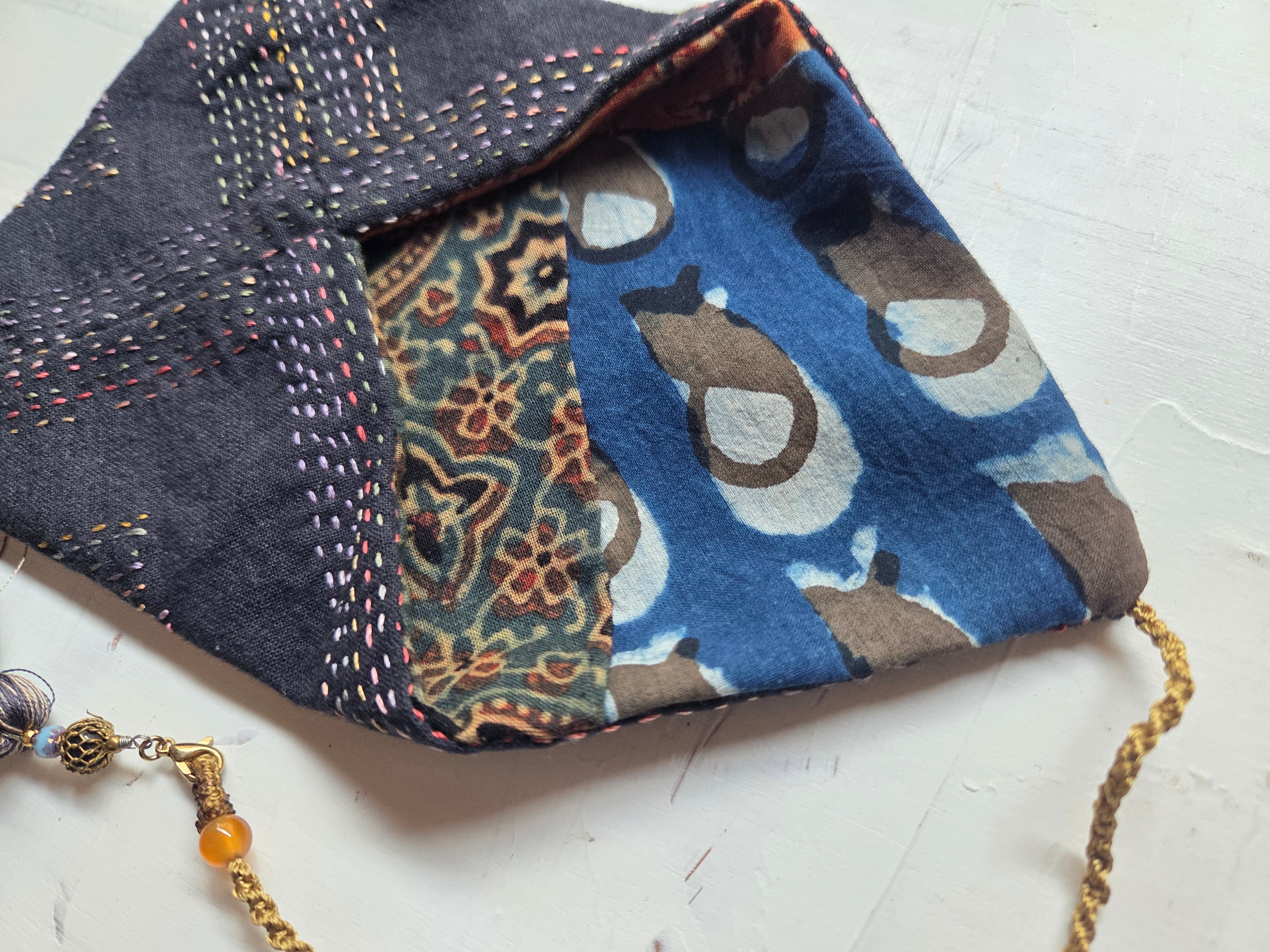 内布にはブロックプリントの生地を使用しており、華やかな印象を与えるデザインが魅力的です。ハギレを活用したこのポーチは、個性的な一品としてお使いいただけます。