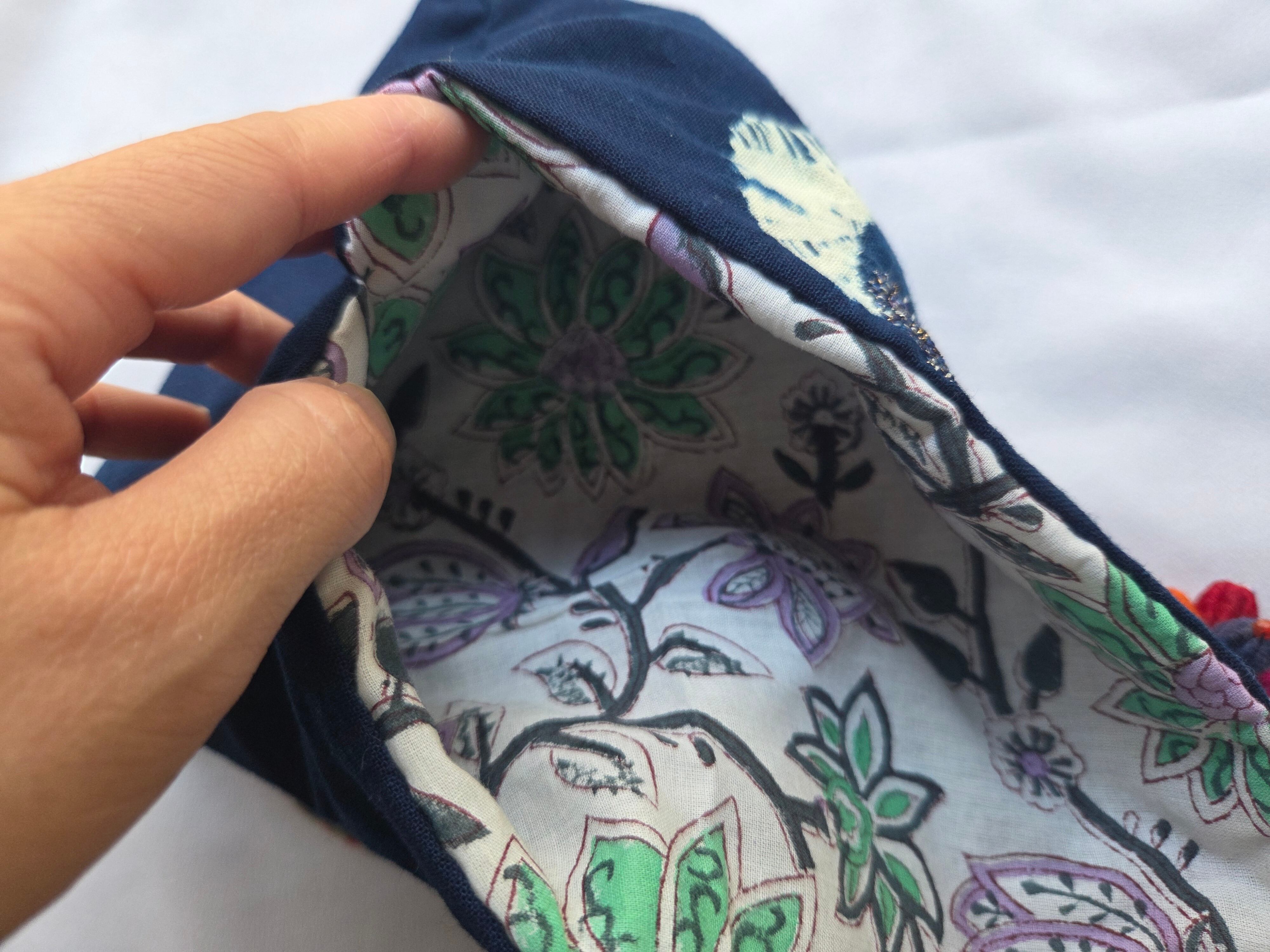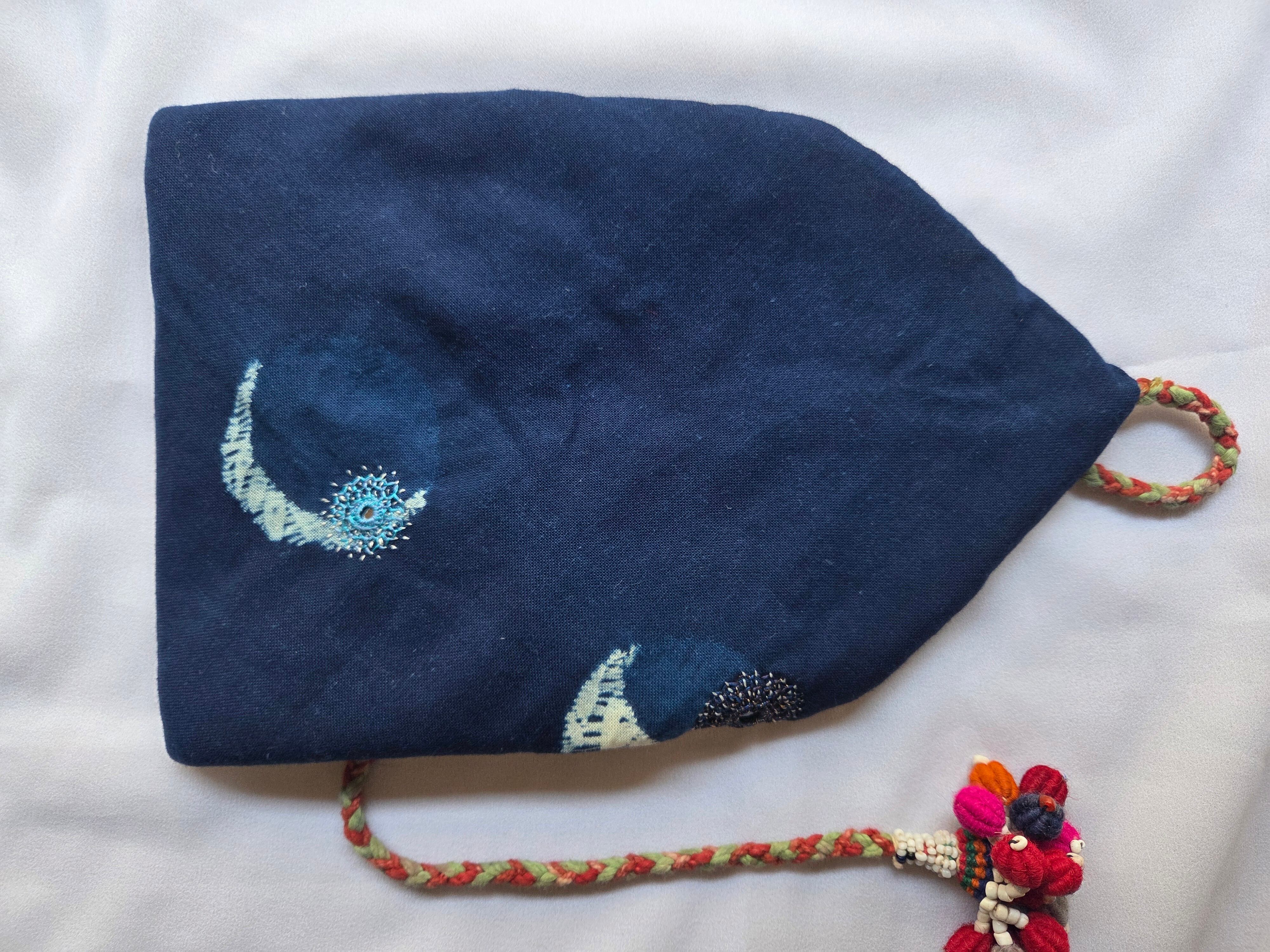 四季折々の美しい藍染布を使用し、深い色合いと独特の風合いを楽しむことができます。また、ミラーワーク刺繍が施されており、月の満ち欠けをイメージしたデザインが光を反射し、華やかさを演出しています。内布にはインドのブロックプリント布を使用し、厚みのある柔らかな仕上がりになっています。