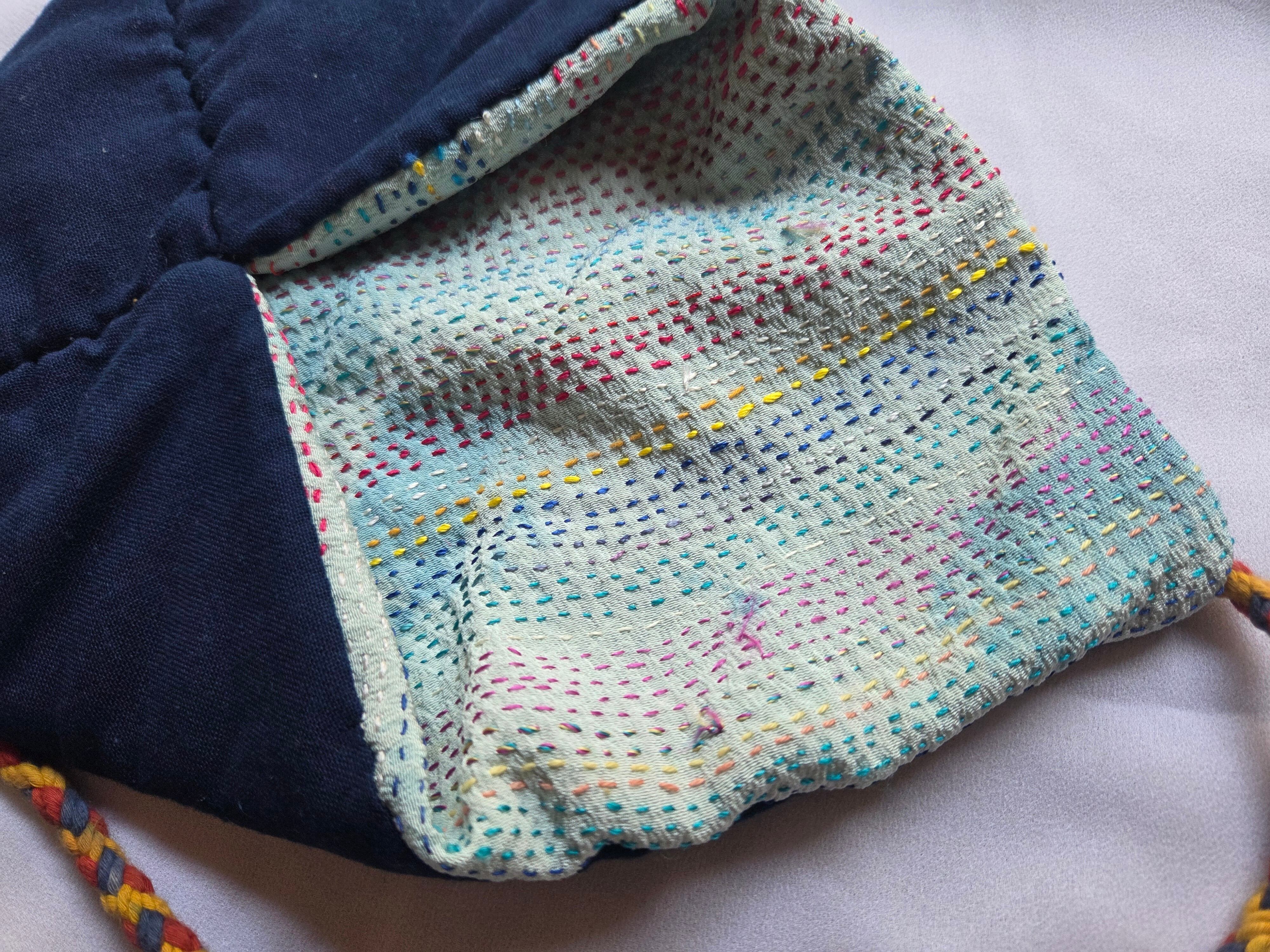美しい藍染布を使用し、深い色合いと独特の風合いを楽しむことができます。また、ミラーワーク刺繍が施されており、月の満ち欠けをイメージしたデザインが光を反射し、華やかさを演出しています。内布にはちりめん生地に並縫いを施し、厚みのある柔らかな仕上がりになっています。