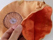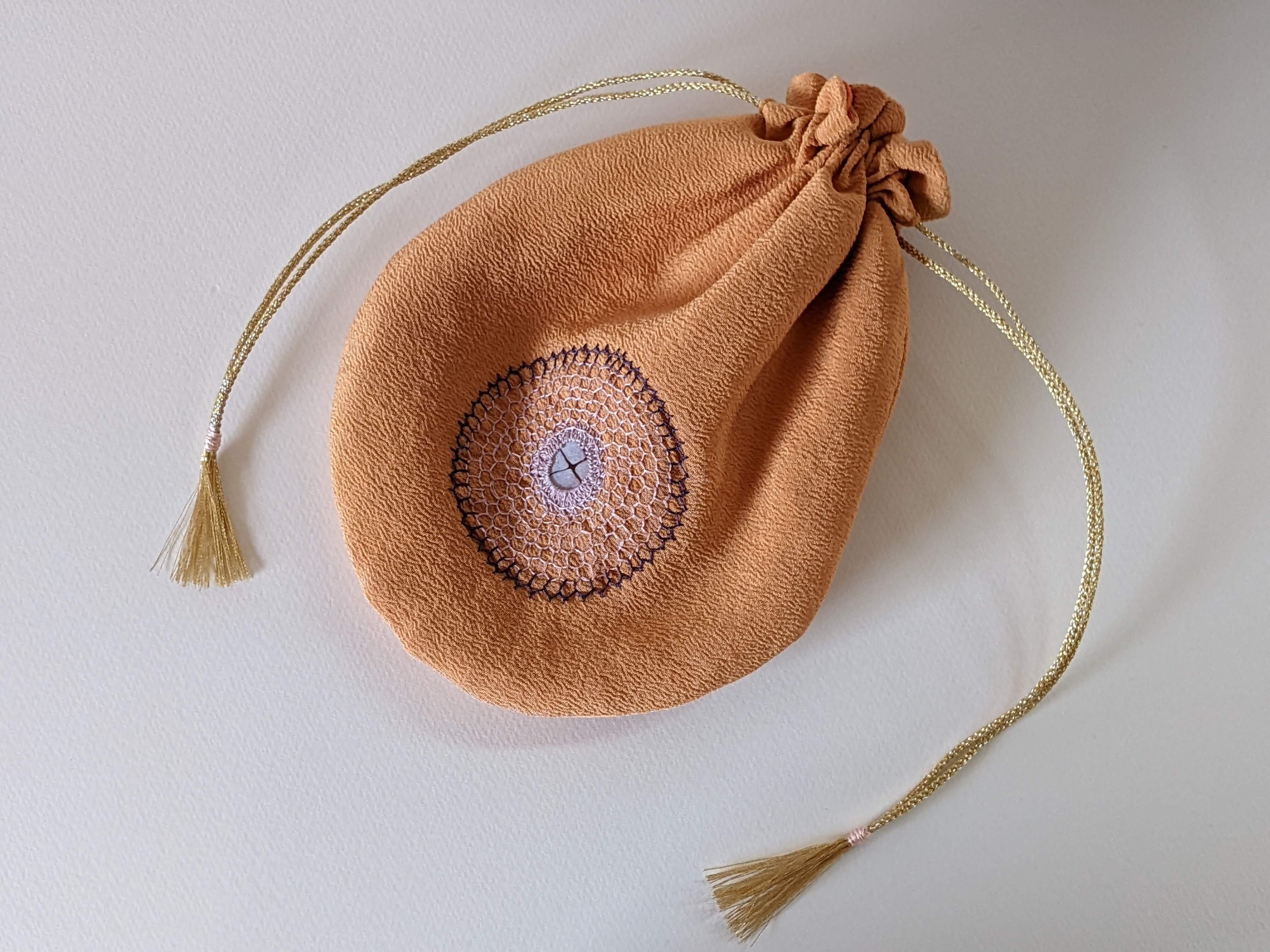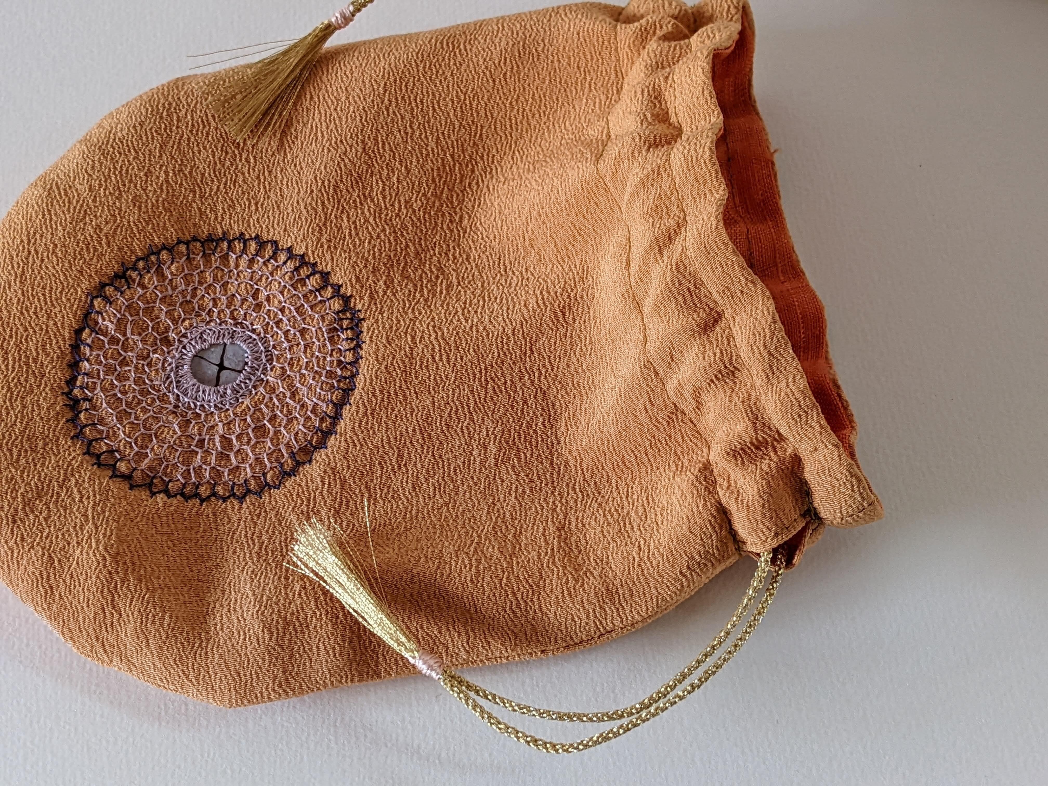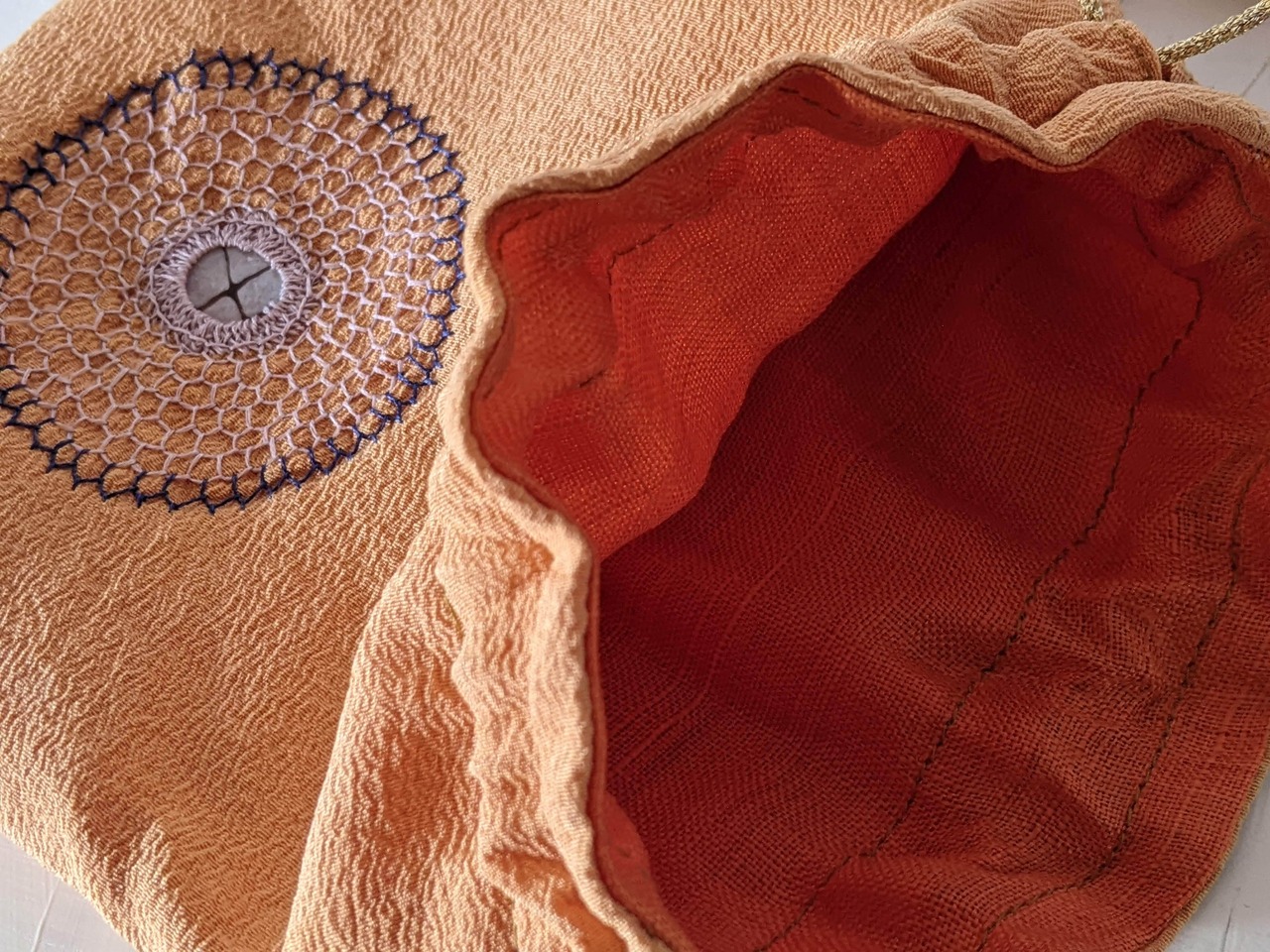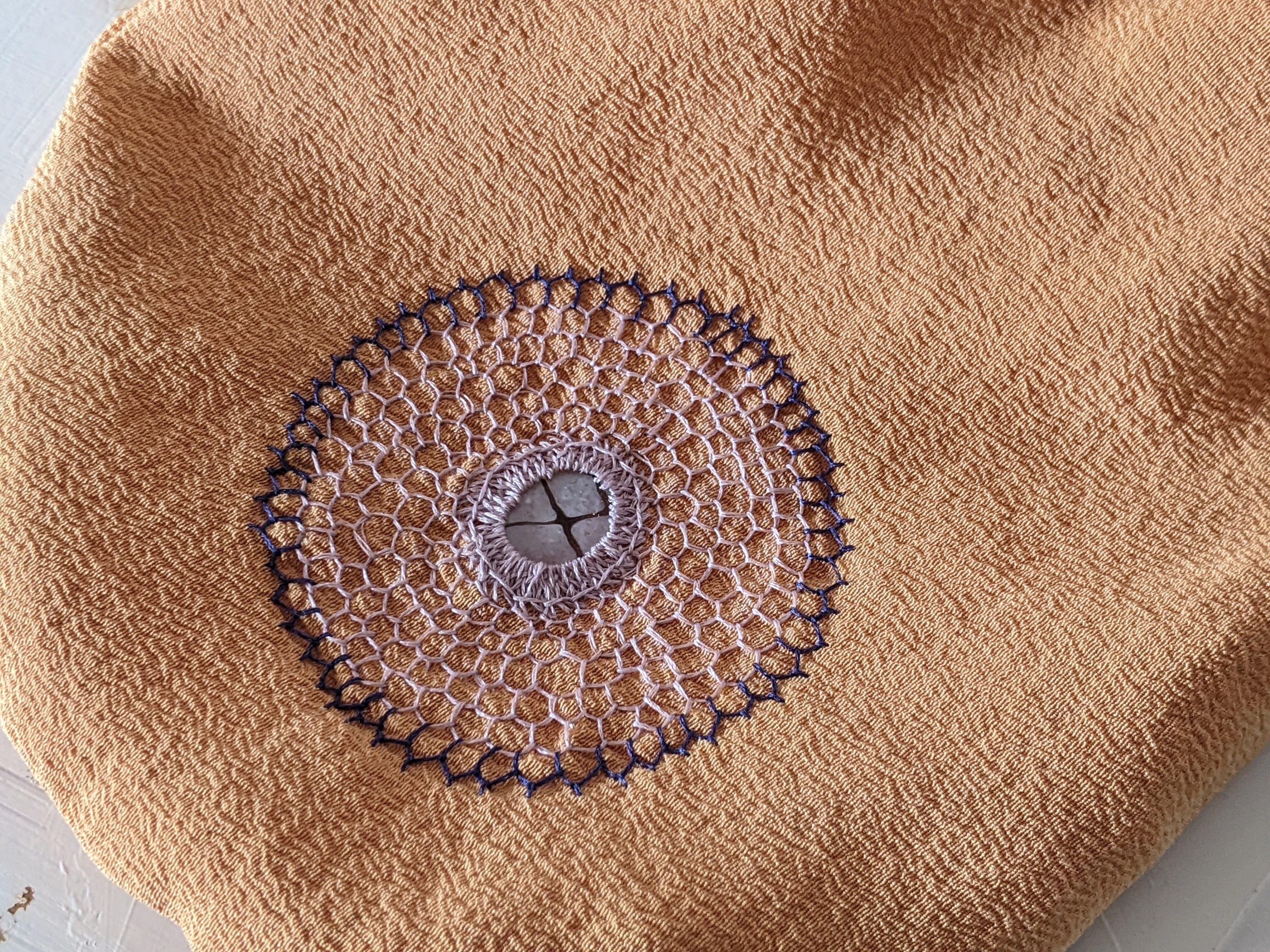宮古島で草木染した布に、ミラーワーク刺繍のやり方で手焼きガラスを縫い込みました。